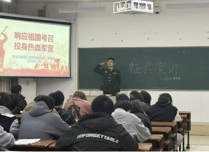 12月17日,为进一步激发青年学子深厚的家国情怀与责任担当,鼓励更多符合年龄条件的大学生积极投身于国防建设事业,安全与管理工程学院组织大学生征兵宣传活动。活动邀请了学校内的退役大学生代表,在教室里对同学们分享他们的军旅经历与成长感悟,向全院适龄学子发出“参军报国、不负韶华的号召,引导同学们把个人理想融入国家发展大局,用实干担当书写无悔青春。