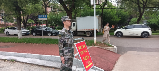 在考生陆陆续续进考场,准备开考后,护校队队员们严格落实安保执勤要求,坚守岗位,防止无关人员穿越警戒线,影响考场纪律。十二点四十分,在考生们全都离场后,护校队队员们稍作休息,各自吃完午餐后立即回到了自己的岗位。
