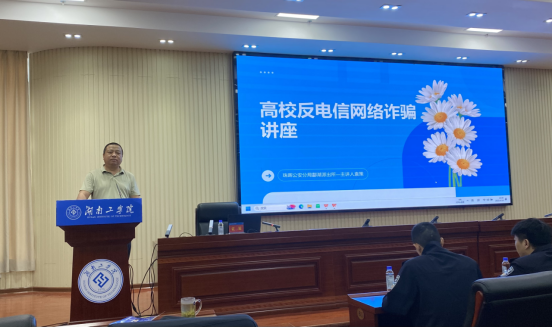 为全面提高Beat365师生防范电信诈骗意识,筑牢校园网络安全防线,4月24日保卫部邀请了酃湖派出所副所长袁策给全体辅导员、国安专任教师及学生代表开展了一场反电诈知识讲座。