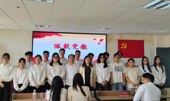 刘赢时、李前奔依次为新发展党员佩戴党徽并集体合影。