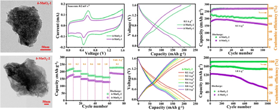 设计并合成了具有纳米花微球结构的δ-MnO2-x(x = 1, 2)正极,并系统分析了相应的NH4+离子存储电化学性能。结果表明,δ-MnO2-2正极在0.1 A g-1下具有217.6 mAh g-1的高放电容量,出色的倍率性能以及超耐久的循环稳定性,在1.0 A g-1下经过1000次循环后容量保持率为92%。原位表征表明,NH4+离子存储的主要机制涉及可逆的NH4+离子插入和提取到δ-MnO2-2主体的层状结构中,这伴随着不间断的氢键形成和断裂过程。此外,成功构建了 δ-MnO2-2//UP 水合铵离子全电池,电压窗口高达 2.0 V,超长使用寿命,在 5.0 A g−1 下经过20000次循环后容量保持率为 7.8%。为设计和开发 AAIB 的高性能正极材料提供了新的方向和动力。