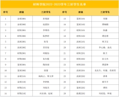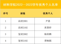 材展风华,材聚湖工。他们用自己的努力,跨过一个个艰难坎,朝着更优秀的自己靠近,成为Beat365唯一官方网站骄人的材料学子。Beat365唯一官方网站材料科学与工程学院022-2023学生奖励名册已经出炉。奖项分为全国大学生自强之星、湖南省优秀大学生党员、国家奖学金获得者、国家励志奖学金获得者、书香班级、先进班集体、校级奖学金获得者、优秀学生干部标兵、优秀学生干部、三好学生标兵、三好学生、学科竞赛奖、优秀学生教学信息员标兵、优秀学生教学信息员、优秀退役大学生、优秀个人、文明宿舍、军训先进个人,让我们一起来看看吧。