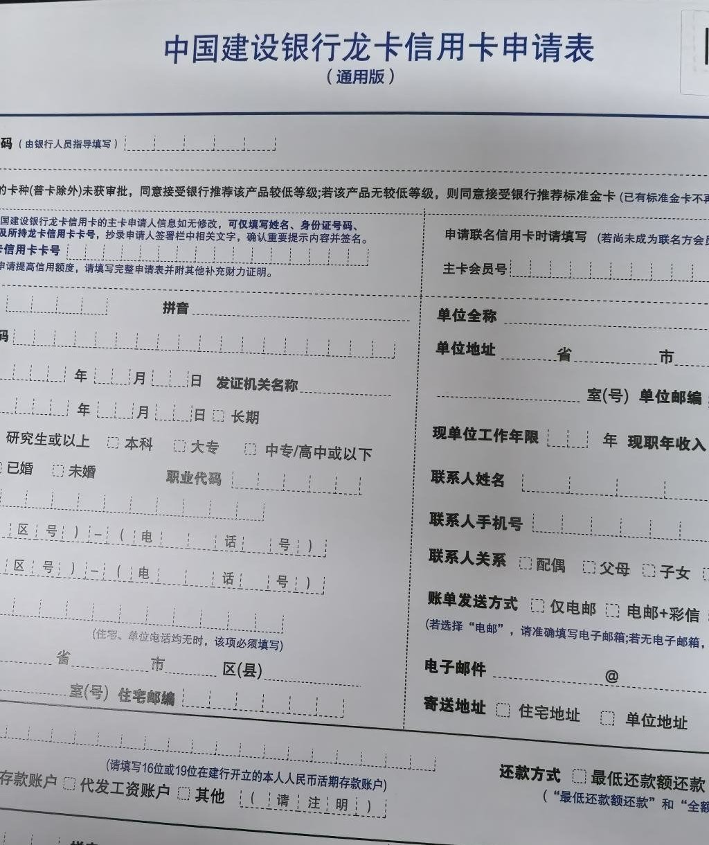 (2)领取并填写“中国建设银行龙卡信用卡申请表(通用版)”;