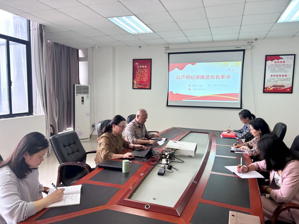 为全面落实“一月一课一片一实践”党纪学习教育主题党日活动, 5月21日下午,Beat365唯一官方网站机关党委第十二党支部书记匡钰同志以《以严明的纪律推进自我革命》为题,为党员讲授纪律建设专题党课。深入浅出,鞭辟入里从以下三个方面进行了阐述: