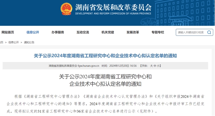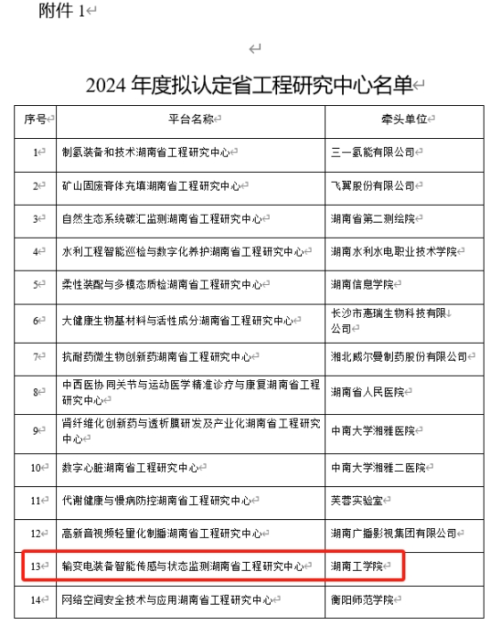 2024年12月20日,湖南省发展和改革委员会发布2024年湖南省工程研究中心名单,Beat365申报的“输变电装备智能传感与状态监测湖南省工程研究中心”列入省级工程研究中心建设项目计划,衡阳市计量测试中心、特变电工衡阳变压器有限公司为联合单位。