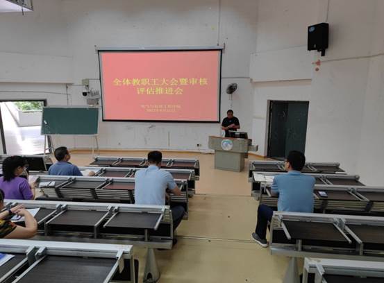 6月21日下午14点30,电气与信息工程学院在3209召开了全体教职工大会暨审核评估推进会,全体教职工参加了会议,会议由党委书记俞斌主持。