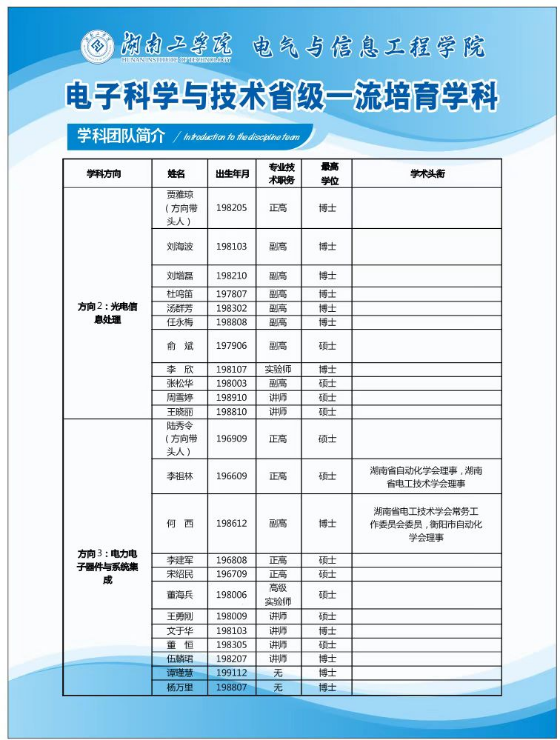 电气与信息工程学院现有8个相关的学科平台,分别为“衡阳市光电信息检测与处理重点实验室”、“衡阳市基于分数阶系统的混沌保密通信技术研究与应用重点实验室”、“衡阳市信息安全及其应用研究重点实验室”、“衡阳市微波光子应用技术重点实验室”、“衡阳市微纳光电器件及应用重点实验室”、光电信息处理与信息安全校级科技创新团队、光电信息检测与处理校级产学研平台、信号与信息处理校级重点实验室。