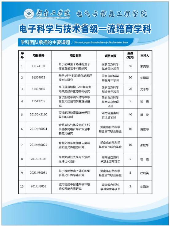 微纳光电器件及应用衡阳市重点实验室:2021年获批为衡阳市重点实验室,以开展光电器件与技术学科领域的应用基础研究为主要任务,研究内容包括新一代光通信器件的设计、微纳量子输运器件设计和光伏发电微电网器件设计。