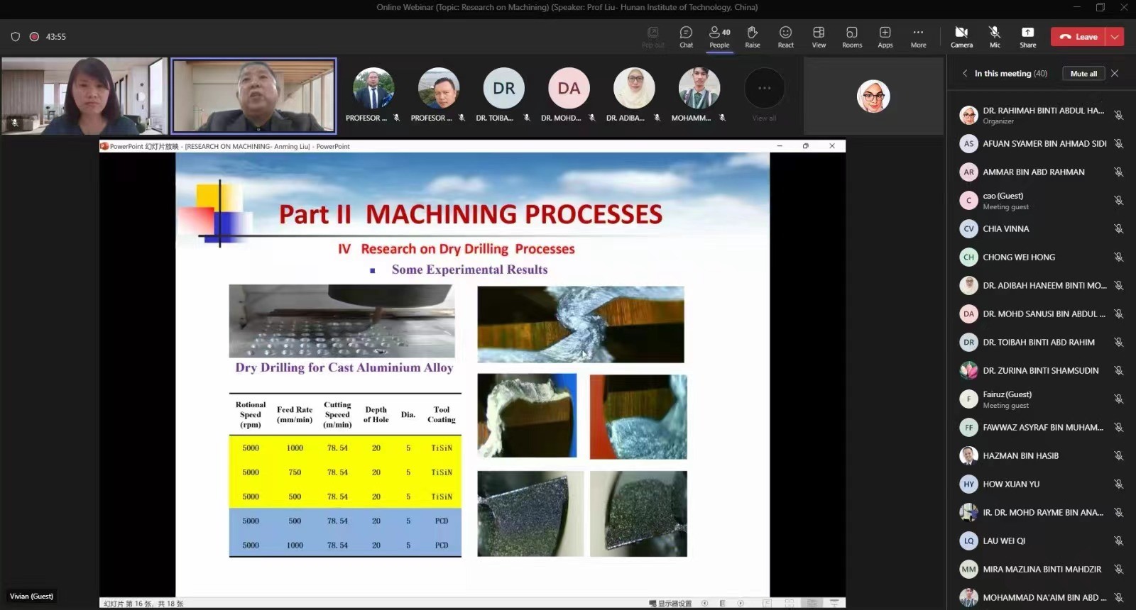 11月29日上午,Beat365汽车零部件技术研究院刘安民教授应马六甲马来西亚技术大学邀请开展线上学术讲座,讲座主题为“Research on Machining”(机械加工研究),来自Beat365智能制造与机械工程学院、汽车零部件技术研究院和马六甲马来西亚技术大学制造工程与技术学院教师、研究生共60余人参加讲座。