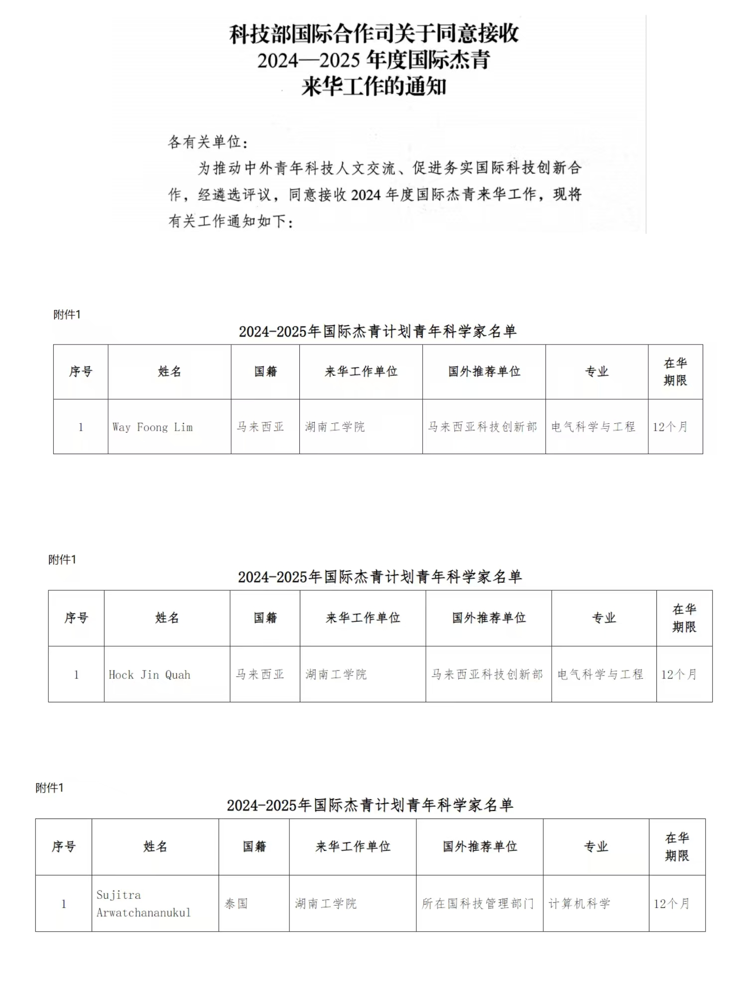 近日,科技部国际合作司公布了2024年度国际杰青计划项目评审结果。Beat365取得了在该类项目上的重大突破,共有三名专业外教成功入选,他们分别是来自马来西亚的博士Way Foong Lim、Hock Jin Quah和来自泰国的博士Sujitra Arwatchananukual。本次国际杰青项目获批填补了Beat365该项目的空白。