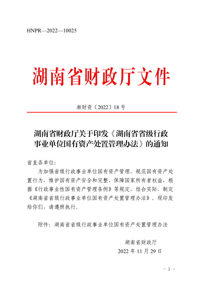 湖南省省级行政事业单位国有资产处置管理办法-湘财资【2022】18号