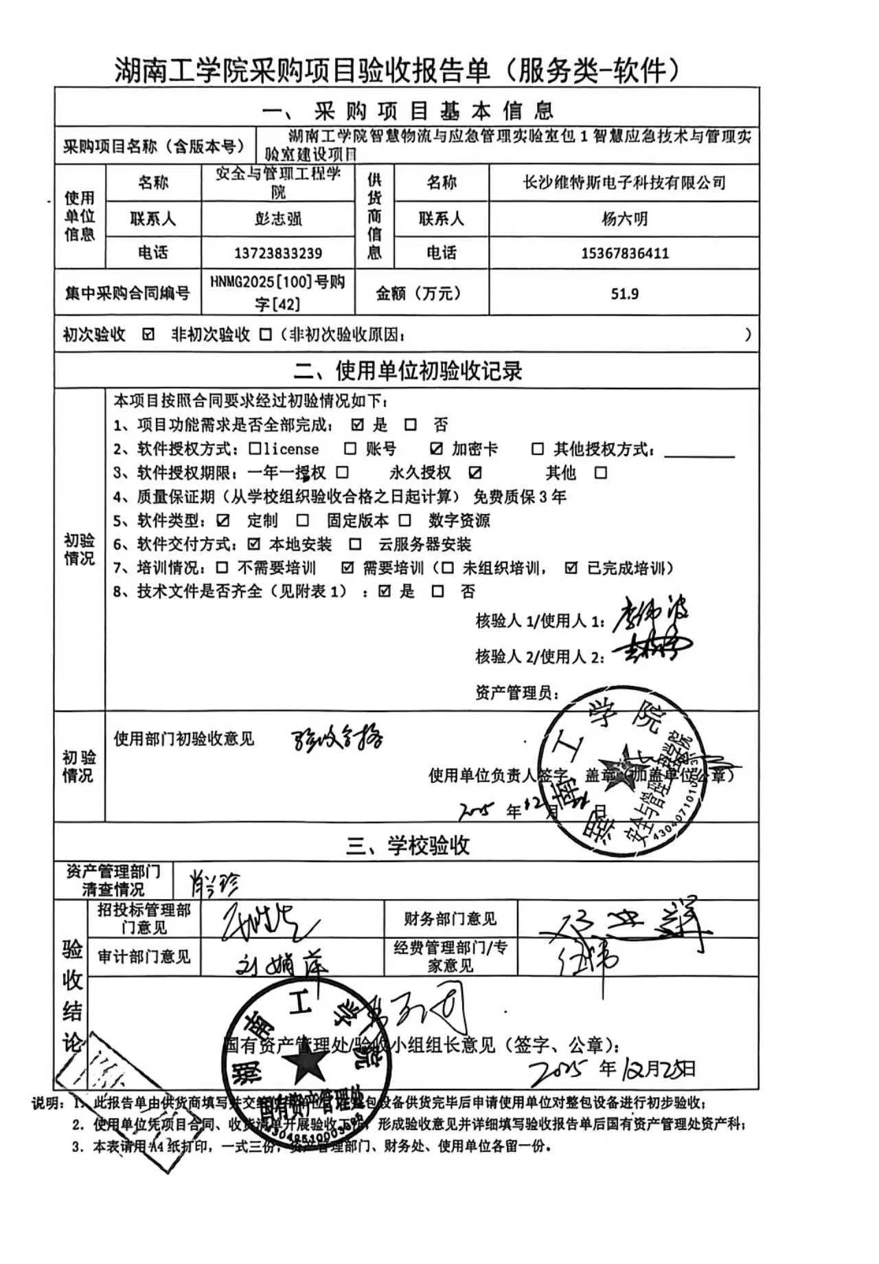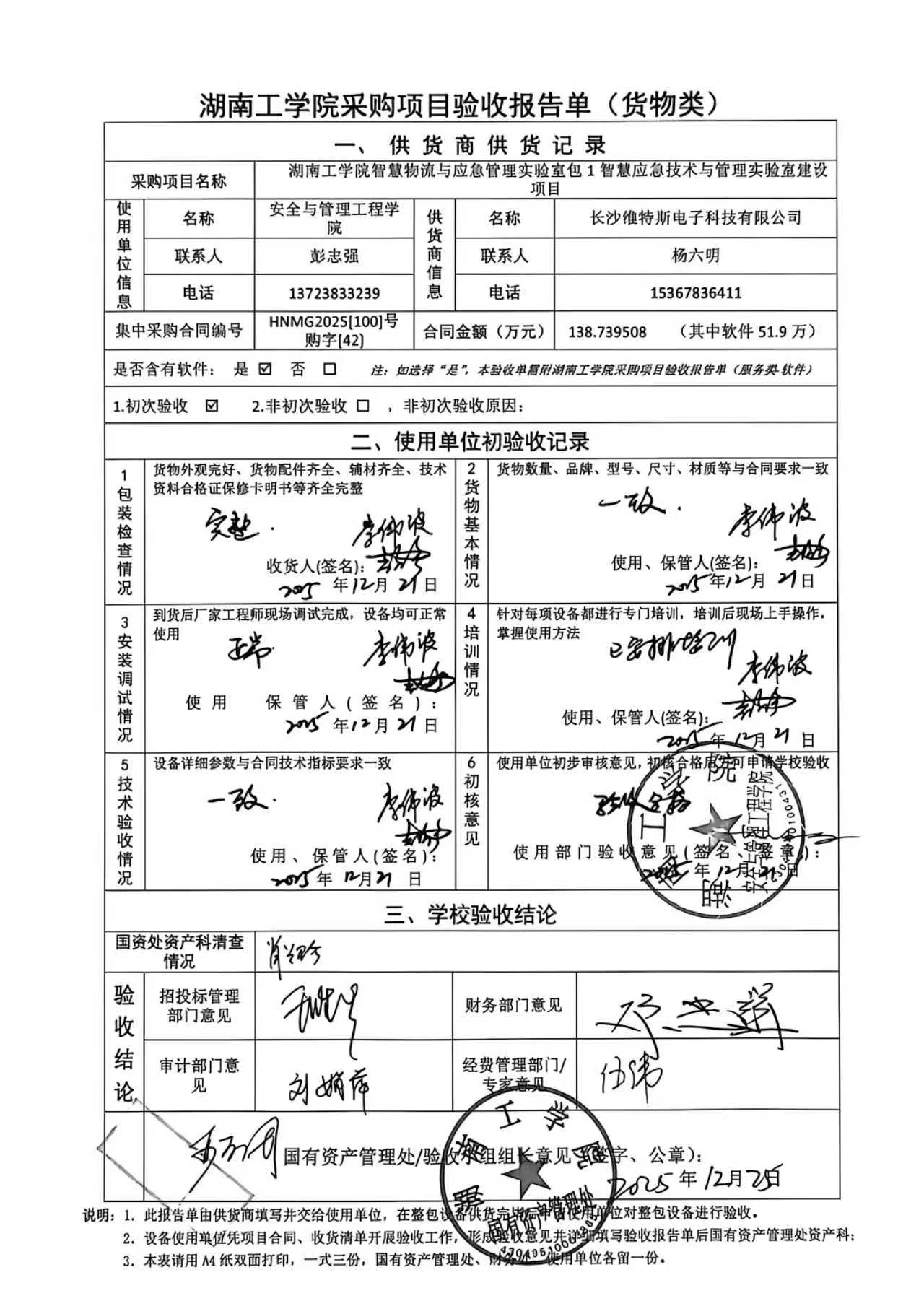 根据国有资产管理处对采购项目的验收安排,2025年12月23日国有资产管理处组织招投标管理与服务中心、审计处、财务处、教务处以及使用部门代表对供应商的项目进行现场验收。