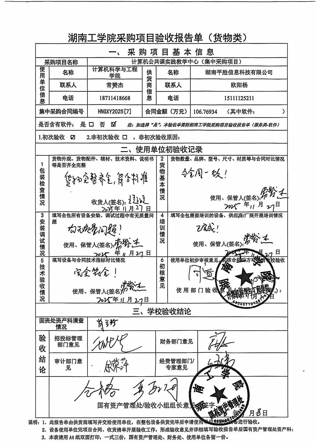 根据国有资产管理处对采购项目的验收安排,2025年12月10日国有资产管理处组织招投标管理与服务中心、审计处、财务处、教务处以及使用部门代表对供应商的项目进行现场验收。