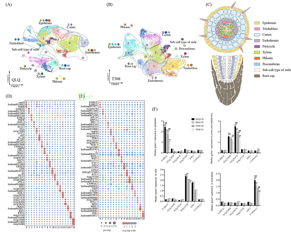 20253月,Horticulture Research在线发表了我院环境污染控制与修复科技创新团队题为《Uncovering differences in cadmium accumulation capacity of different Ipomoea aquatica cultivars at the level of root cell types》的研究论文。该研究利用单细胞RNA测序(scRNA-seq)技术,首次在细胞类型水平解析了蕹菜高镉品种T308和低镉品种QLQ的镉吸收、固定和运输差异机制。