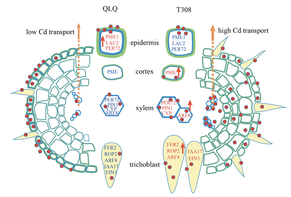 研究发现,QLQ表皮和T308木质部中较高水平的木质素沉积分别与LAC2PER72QLQ表皮中的高表达以及PER72T308木质部中的高表达有关。QLQ表皮中较高的PME活性、果胶去甲酯化及木质素含量有助于镉的固定,从而减少镉进入木质部和向地上部分的运输。相比之下,T308更发达的木质部和毛细胞,以及木质部中较高的镉含量,促进了镉向地上部分的运输。这些机制共同解释了QLQT308Cd固定和运输方面的差异。