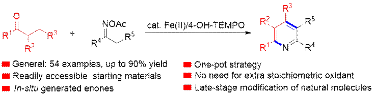近日,我院刘炎云博士在《The Journal of Organic Chemistry》(中科院二区)发表了题为《Iron-Catalyzed One-Pot Cascade Reactions of Oximes with Inactivated Saturated Ketones: Entry to Highly Substituted Pyridines》的研究论文。吡啶不仅是天然产物和药物中的常见骨架,而且在功能材料、配体和有机催化中也起着重要作用。肟酯作为C-C-N合成子和内氧化剂,已被广泛应用于吡啶骨架的合成。利用肟酯[3+3]环化反应是构建吡啶衍生物一种非常有效的方法,然而,已报道的合成方法需依赖于缺电子α,β-不饱和酮或设计具有大离去基团的预官能化骨架的α,β-不饱和酮亚胺,且往往使用对环境影响较大的铜催化剂。本文使用廉价、低毒的铁催化剂,通过氧化脱氢共轭加成、环化和氧化芳构化一锅串联反应,将简单易得的肟酯和不活泼饱和酮一步转化为吡啶化合物。机理研究表明,该反应涉及自由基过程,原位生成的α,β-不饱和酮是反应中的关键中间体。