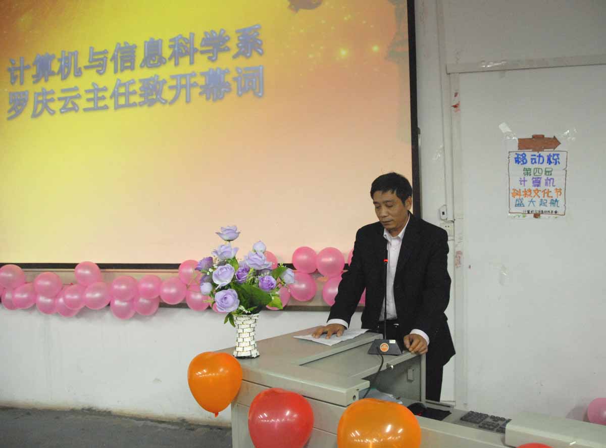 开幕式上,计算机与信息科学系主持全面工作的副主任罗庆云致开幕词。他对第四届计算机科技文化节的开幕表示最热烈的祝贺,对协办本次科技文化节活动的移动公司、金在线公司表示感谢。他指出在全院上下迎接学士学位授予权评估的关键时期,举办第四届计算机科技文化节,其目的是进一步活跃校园科技文化氛围,全面促进学院教育质量工程和校园文化建设,他希望以本届科技文化街为契机高举爱校大旗,扬起科技文明的风帆,凝聚力量、整合资源、提升素质,全面展现计算机与信息科学系的团结、和谐、文明、进取的良好形象。