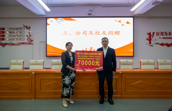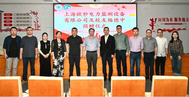 黄红卫为杨德中和上海欧秒电力监测设备有限公司颁发捐赠证书,高度肯定校友感恩之举,他指出校友反哺是母校发展的宝贵动力,该设备捐赠既为大赛提供硬件支持,也传递“饮水思源、感恩回馈”精神。他强调应用型教育的核心是“产教融合、协同育人”,希望以此次捐赠为契机,铸牢校友与母校情感纽带,实现良性互动;用好捐赠设备,制定管理机制,融合教学与实践;推动赛训结合,鼓励教师以赛促教、促研;深化校企合作,拓展就业创业与科研攻关合作空间。