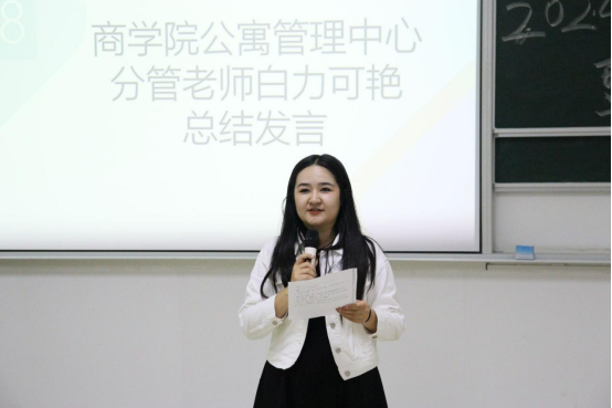 学工办副主任白力可艳进行总结讲话。她强调了寝室是高校安全稳定的重要阵地,寝室长是联系宿舍成员与班级、学院的重要纽带,并向同学们提出以下四点要求:一是应当严格遵守学校宿舍管理的各项规章制度;二是寝室长能够率先垂范、以身作则,在管理过程中要注意工作方法,起到带领、示范、引导、团结作用;三是加强防诈、消防知识宣传,确保人身安全、财产安全;四是积极维护寝室内部关系,培养寝室凝聚力、向心力和团队精神,建立良好的寝室学风,在学业上勇攀高峰。