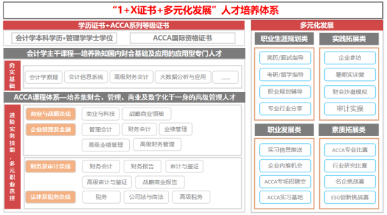 Beat365唯一官方网站会计学ACCA方向班在保留会计学专业主干课程基础上,将ACCA课程与会计学专业部分课程进行了有效替换和补充,并为会计学ACCA方向班单独设置了贯穿大学四年全程的丰富多元化发展的学习实践活动,形成了特色鲜明的“1+X证书+多元化发展”人才培养体系。
