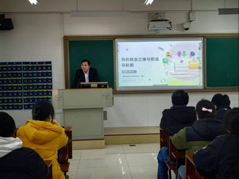 课堂上,杨桂云分享了自身22年从中专到博士的求学之路,以及从基层财务到湖南省总会计师协会会长的职业跃迁经历。他结合备考时啃高数、研读文献的点滴,寄语新生“与其幻想未来做什么,不如想好在学校该学些什么”,朴实的话语让迷茫的新生们深受触动。