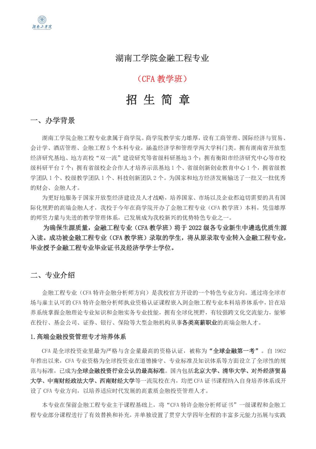 2022年Beat365唯一官方网站金融工程专业(CFA教学班)招生简章.docx