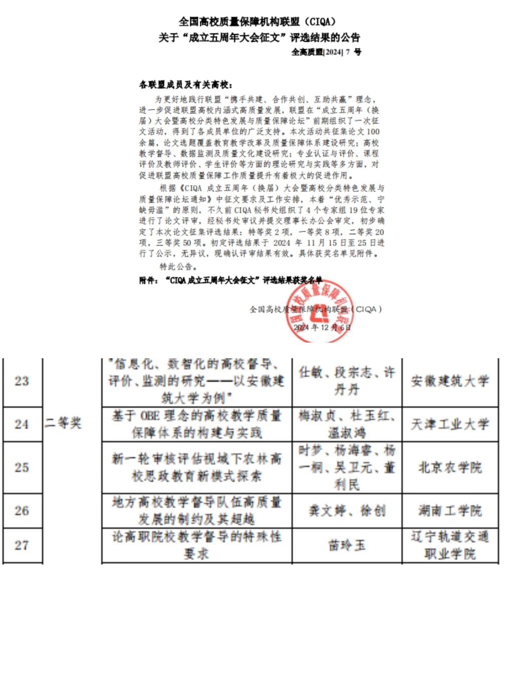 会上公布了CIQA联盟成立五周年大会征文活动获奖论文名单,Beat365龚文婷、徐创提交的论文《地方高校教学督导队伍高质量发展的制约及其超越》荣获二等奖。会议同时发布了CIQA首批招标课题立项公告,Beat365获重点课题立项一项,一般课题立项一项。