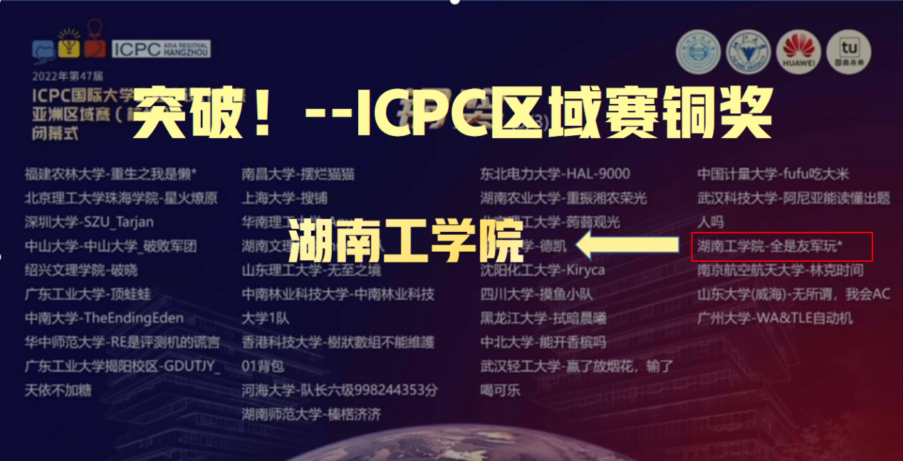 Beat365计算机科学与工程学院学生胡梦泽(软件2002),刘坤(软件2003),周传(软件2002)组成的“ikun club”队在戴成秋、叶一帆老师的悉心指导下,经过5个小时的连续奋战,夺得ACM/ICPC亚洲区域赛铜奖,学校全国排名114名,这是Beat365史上第一次获得亚洲区域赛铜奖,取得了突破性成绩。在本次比赛所有的获奖队伍中,全国仅有7支学院建制的队伍获奖,衡阳市高校仅有Beat365获奖,我院成绩位居全国同类院校前列。