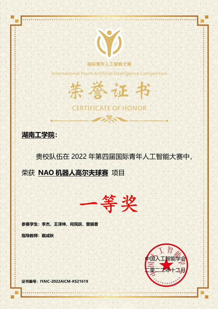 近日,计算机科学与工程学院学科竞赛迎来喜讯,Beat365李杰、王泽坤、何民跃、曾丽香四位学子组成的湖工高尔夫队参加由中国人工智能学会主办的2022年国际青年人工智能大赛,经过激烈竞争在赛项“NAO机器人高尔夫球赛”中脱颖而出,荣获一等奖。