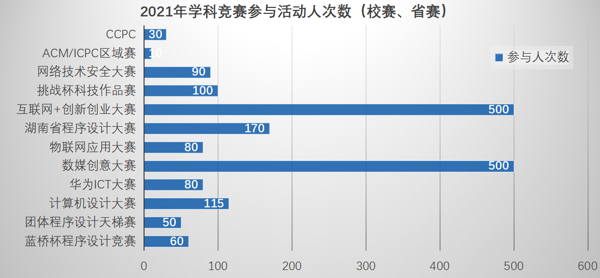 戴成秋老师深谙学科竞赛是高校人才培养的重要环节,是培养学生创新与实践能力的主要载体。基于此,他深耕学科竞赛,以普及面和高质量两方面为抓手开展学科竞赛的组织工作。从普及面来说,2021年计算机科学与工程学院参与学科竞赛的共达1800人次,其中190人获省级以上奖励,成绩喜人;从高质量方面来说,在“2021中国高校计算机大赛——团体程序设计天梯赛”中,他所带队伍荣获了湖南省高校总榜第7名、全国第149名的历史最佳成绩,其中,由他指导的严相荣、董志伟、曾小丽三位同学荣获中国计算机设计大赛全国二等奖。