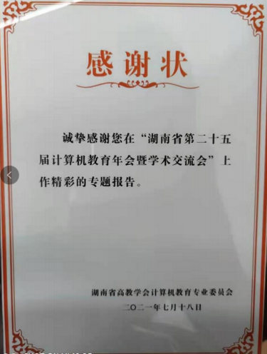 在多年的努力下,他主持完成的省级教研教改课题荣获结题优秀,负责的《数据结构》和《Python语言程序设计》两门课程成功立项湖南省一流课程建设项目,带领的计算机基础教学团队拿到了省、校级教学竞赛奖励10余项,发表的教学论文荣获2020年第四届全国高校计算机教育青年教师优秀论文二等奖,受邀在湖南省计算机教育大会、国家虚拟教研室教研会等场合中作报告10余次。