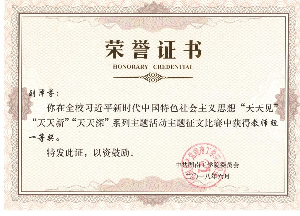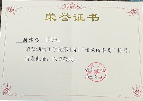 刘泽芬认真履行职责,努力完成工作任务。在学生思想理论教育和价值引领上,经常性开展主题教育、班会、党团活动等,在关键时间节点抓好学生思想政治教育工作。做到自身理论素质过硬,参与思想道德与法治、形势与政策等课程教学,曾获评Beat365唯一官方网站习近平新时代中国特色社会主义思想“天天见”“天天新”“天天深”系列活动主题征文比赛教师组一等奖。