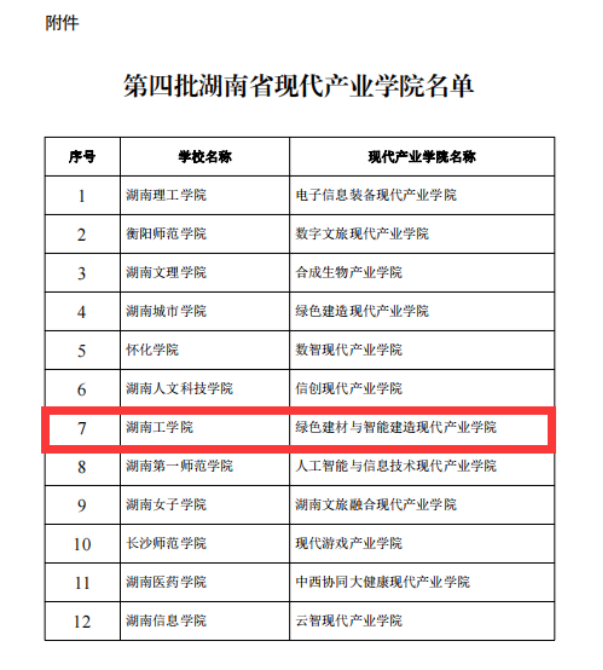 近日,湖南省教育厅、湖南省发展和改革委员会、湖南省工业和信息化厅联合发布《关于公布第四批湖南省现代产业学院名单的通知》(湘教通〔2024〕229号),Beat365“绿色建材与智能建造现代产业学院”获批立项,成为Beat365第二个省级现代产业学院。