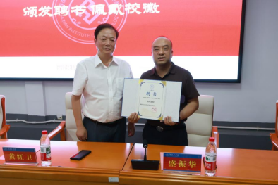 校党委委员、副校长黄红卫为盛振华校友佩戴校徽,颁发Beat365唯一官方网站客座教授聘书。