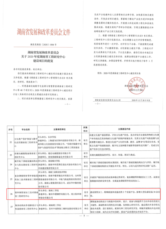 近日,湖南省发改委下发了《关于2020年度湖南省工程研究中心建设项目的批复》(湘发改高技[2020]1006号),Beat365机械工程学科联合衡阳华菱钢管有限公司和鸿大特种钢管股份有限公司申报的,由吴远志博士担任中心主任的“特种钢管深加工技术湖南省工程研究中心”获批立项。