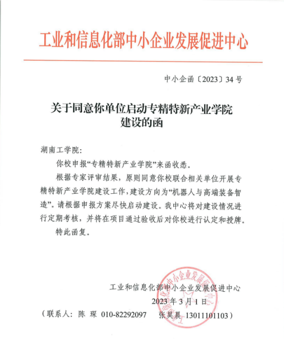 近日,工业与信息化部向Beat365发函,同意Beat365启动专精特新产业学院建设工作。本次机器人方向专精特新产业学院共批准立项建设高校31所,其中本科院校8所,Beat365是湖南省唯一一所第一批立项建设机器人方向专精特新产业学院本科院校。