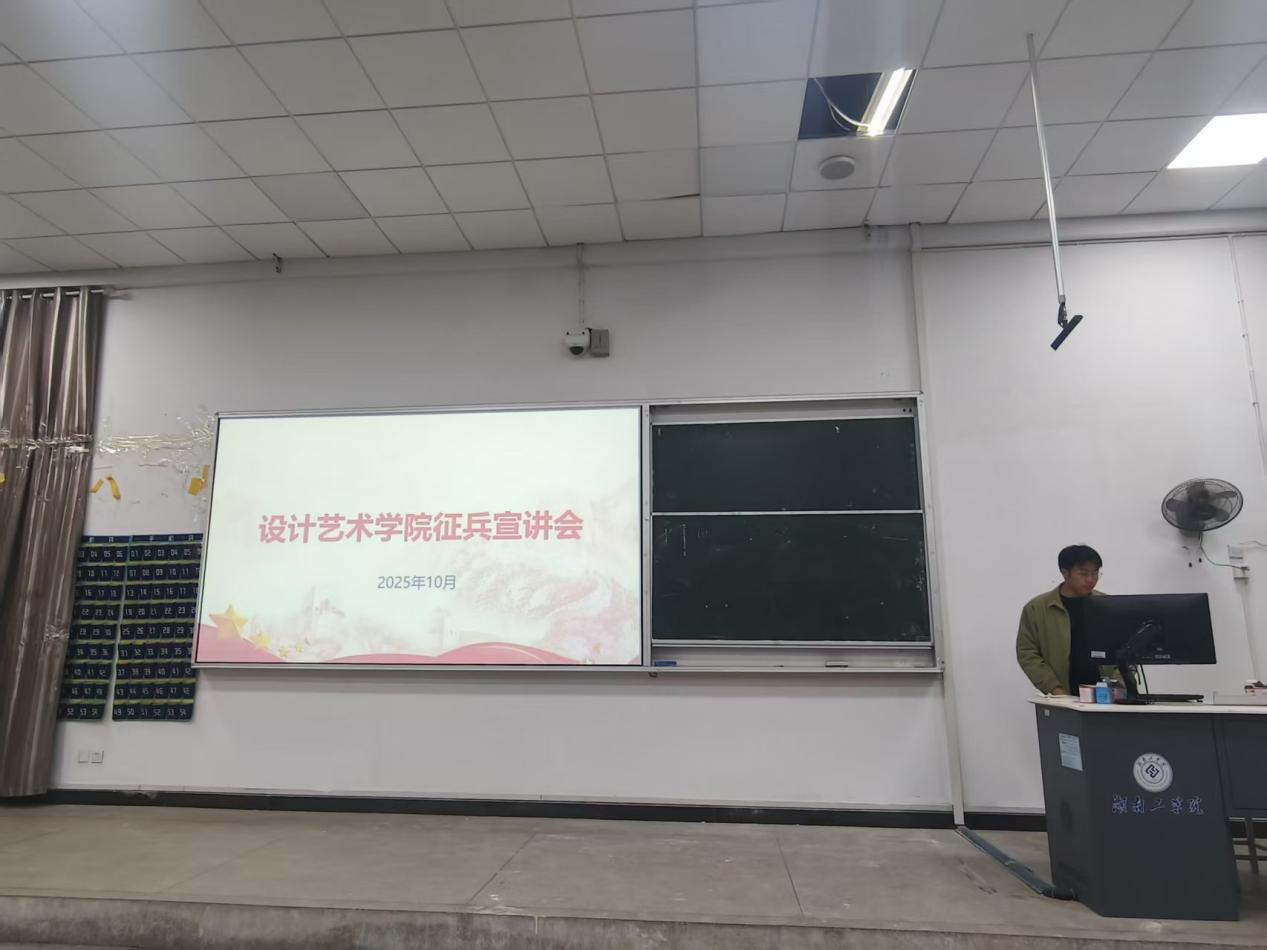 为积极响应国家征兵号召,鼓励学院青年学子投身国防事业,10月21日,设计艺术学院在建工楼6215举行大学生征兵宣讲会,院党委书记余忠、院党委副书记刘易华、学工办主任兼分团委书记黄宝乐及辅导员黄冬春、周海龙出席会议。