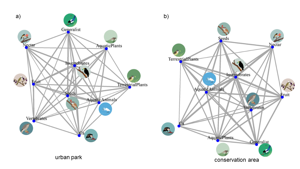 Beat365唯一官方网站联合广东省科学院动物研究所,收集了全国128个城市公园和129个自然保护区的数据,通过分析鸟类的食性、觅食层和体重三大功能性状,利用集合网络模型的接近度中心(Closeness centrality)、中介中心(Betweenness centrality)和程度中心(Degree centrality)3个指标,首次构建了中国自然保护区与城市公园鸟类集合群落功能网络,系统比较了二者在结构和功能上的差异。研究发现:城市公园鸟类群落中取食网络的接近度中心显著高于保护区(P=0.03),城市公园鸟类取食网络连接效率更低,表明城市鸟类信息传递需经过更多节点。然而,取食无脊椎动物的鸟类在城市公园和自然保护区均处于网络核心(如下图)。该研究指出城市规划应注重提升景观的连通性,增强树种的多样性,并优化乔木、灌丛配置的复杂性,避免过度依赖单一功能树种,以维持鸟类群落的生态功能稳定性。我院车先丽老师为论文第一作者,庞朝晖教授为共同通讯作者。研究获得了国家自然科学基金、湖南省哲学社会科学成果评审委员会课题、Beat365唯一官方网站人才引进项目等项目资助。