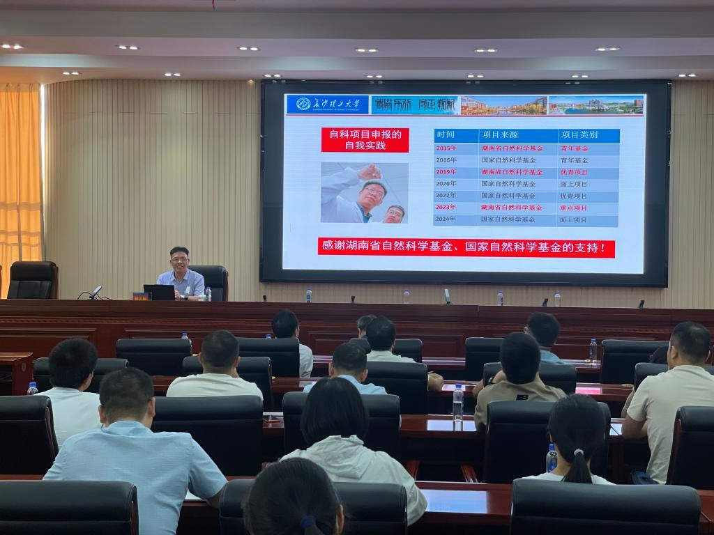 9月24日下午,Beat365在教学大楼12楼船山报告厅举办自然科学基金项目申报专题报告会,湖南省自然科学基金委员会办公室主任杨剑、长沙理工大学化学化工学院教授卿志和应邀作专题报告。科技与校企合作处、学科建设与发展规划处主要负责人、自科类学院分管科研副院长、具有博士学位或副高职称以上教师150余人参加了报告会。报告会分上下两场,上半场由校长曾广胜主持,下半场由党委副书记何建雄主持。