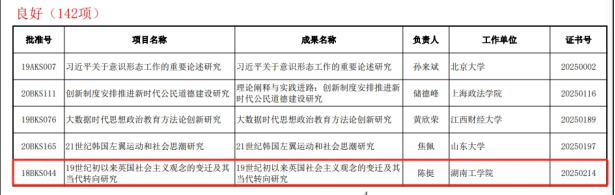 近日,全国哲学社会科学工作办公室公布了《2025年1月国家社科基金年度项目结项情况》,我院陈挺博士主持完成的国家社科基金项目“19世纪初以来英国社会主义观念的变迁及其当代转向研究”,经责任单位审核、省级主管单位受理、同行专家鉴定、全国社科工作办审批,最终由全国社科工作办一次验收通过,并以扎实的研究成果从全国460个结项项目(338个项目予以结项、121个项目暂缓结项,1个项目被终止)中脱颖而出,喜获“良好”等级(结项证书号:20250214),这也是我院加强有组织科研、深化科研项目管理的重要成效。