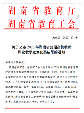 近日,“2020年湖南省普通高校教师课堂教学竞赛”获奖结果公布,我院副院长伍小乐博士喜获三等奖。