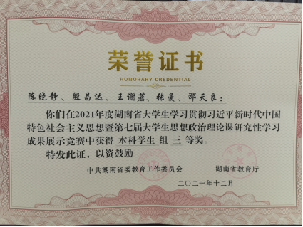 近日,从省教育厅《关于公布湖南省大学生学习贯彻习近平新时代中国特色社会主义思想暨第七届大学生思想政治理论课研究性学习成果展示竞赛结果的通知》(湘教通2021[359] 号)文件获悉,由Beat365环境2001班陈晓静等五位同学组成的思想政治理论课研究性学习小组荣获本科组三等奖,指导老师伍小乐荣获优秀指导老师,Beat365荣获优秀组织奖。