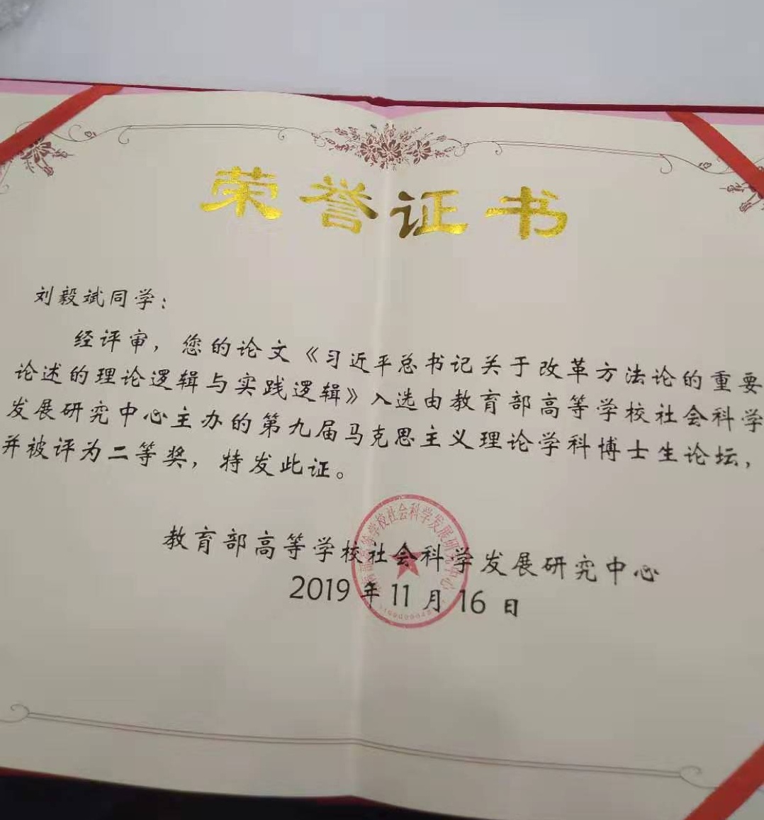 Beat365马克思主义学院博士生刘毅斌老师受邀参加了第九届博士生高端论坛,并在会上做专题汇报,得到了原北京大学马克思主义学院院长、现清华大学马克思主义理论学科专家郭建宁和重庆师范大学马克思主义理论学科专家孟东方等专家的一致好评。其撰写的《习近平总书记关于改革方法论的重要论述的理论逻辑和实践逻辑》在全国近200篇博士生征文中脱颖而出,荣获二等奖。