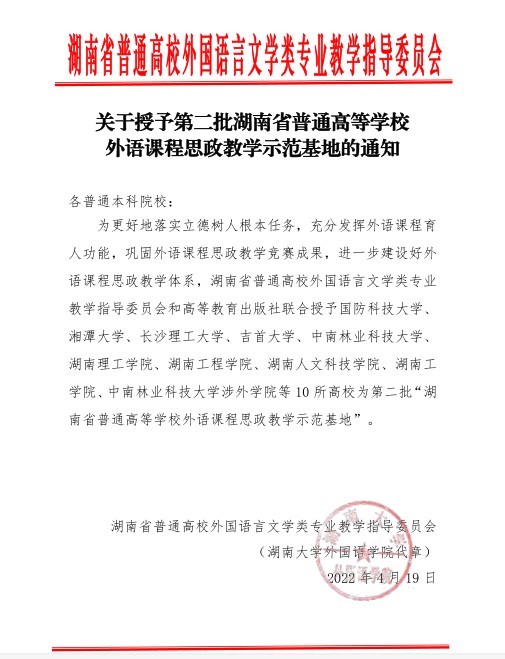4月22-23日由湖南省普通高校外国语言文学类专业教学指导委员会和湖南省高校外语课程思政联盟主办的“湖南省高校外语课程思政高质量建设学术研讨会暨湖南省高校外语课程思政联盟成立大会”在长沙市召开。会上,Beat365被授予湖南省普通高等学校外语课程思政教学示范基地,外国语学院张平、谢争艳被推举为联盟委员,谢争艳被推任为联盟副秘书长。