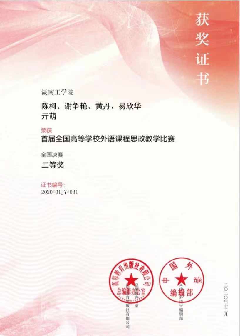 近日,“首届全国高等学校外语课程思政教学比赛”结果揭晓,由省教育厅选送的2020年湖南省外语课程思政获奖团队——陈柯教师团队(团队成员:谢争艳、黄丹、易欣华、亓萌)荣获全国决赛二等奖。