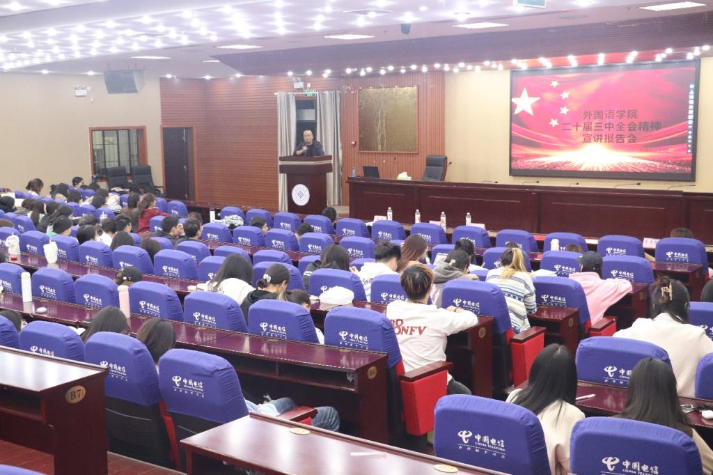 为贯彻落实党的二十届三中全会精神,进一步增强学生党员的使命意识和责任意识。11月7日晚,外国语学院党委书记刘斌在蔡伦报告厅为学生宣讲党的二十届三中全会精神。