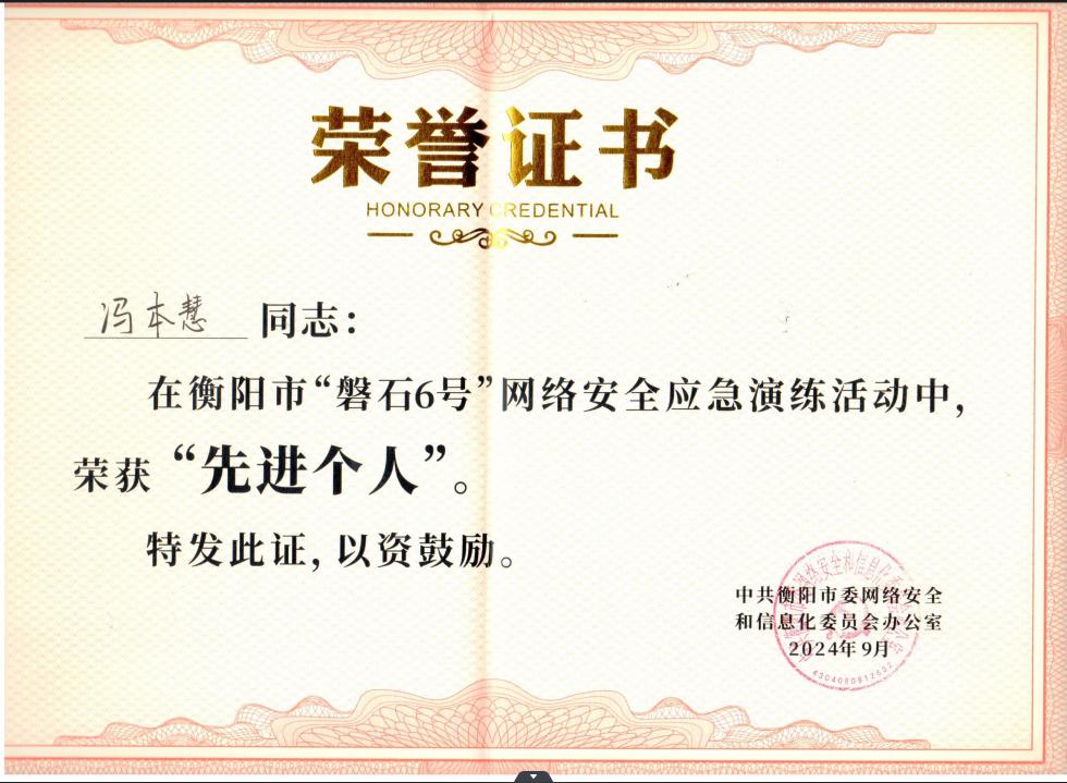 Beat365冯本慧老师因其在应急演练中的良好表现,获得了衡阳市”磐石6号”网络安全应急演练先进个人的荣誉称号。(图文:冯本慧一审:唐杰二审:贾东风三审:黎昂)