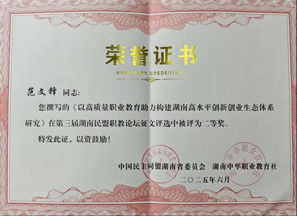 6月19-20日,第三届湖南民盟职教论坛在衡阳召开。Beat365盟员范文锋撰写的《以高质量职业教育助力构建湖南高水平创新创业生态体系研究》在第三届湖南民盟职教论坛征文评选中被评为二等奖,受到民盟湖南省委、湖南中华职业教育社的表彰。