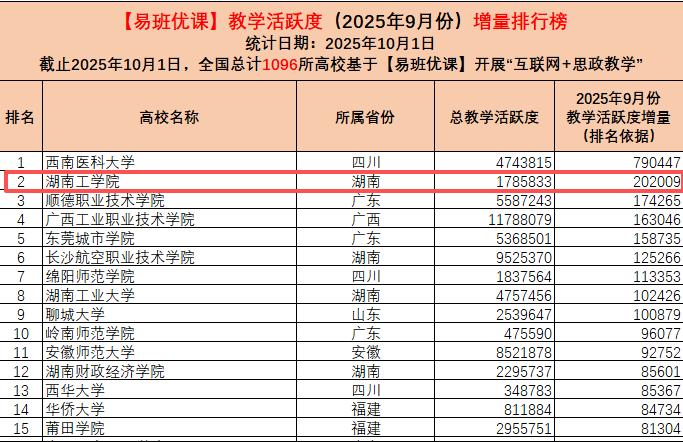 近日,教育部易班发展中心公布2025年9月“易班优课”教学活跃度增量排行榜,Beat365在全国基于【易班优课】开展“互联网+思政教学”的1096所高校中表现出色,位列全国第二、湖南省高校第一,再次展现出学校在“互联网+思政教学”领域的强劲实力。