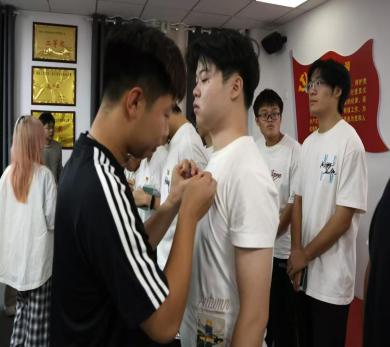 仪式伴随着庄严激昂的国歌正式启幕。各学院团委书记宣读新发展团员名单,老团员为新团员佩戴团徽,团徽不仅是身份的象征,更承载着青年一代的使命与荣光。全体新团员面向团旗,举起右拳庄严宣誓,“我志愿加入中国共产主义青年团……”的铿锵誓言响彻会场,既是对团组织的忠诚承诺,更是矢志奋斗的青春宣言。